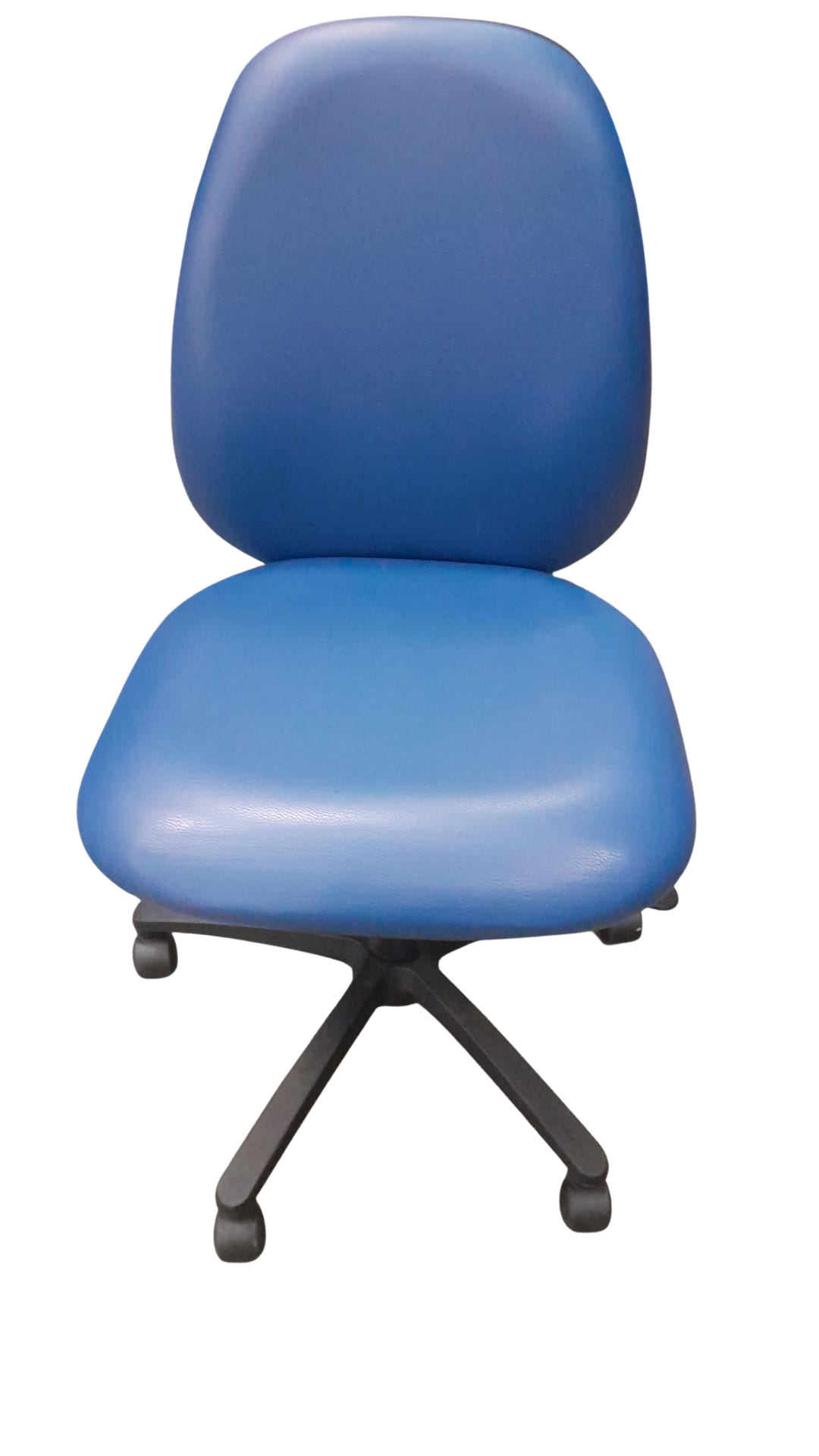 Upholstered in durable blue vinyl, the chair is easy to clean and maintain, making it ideal for high-use commercial settings. The generously padded seat and supportive backrest provide all-day comfort, while the smooth swivel base with castors allows for easy movement around the workstation.